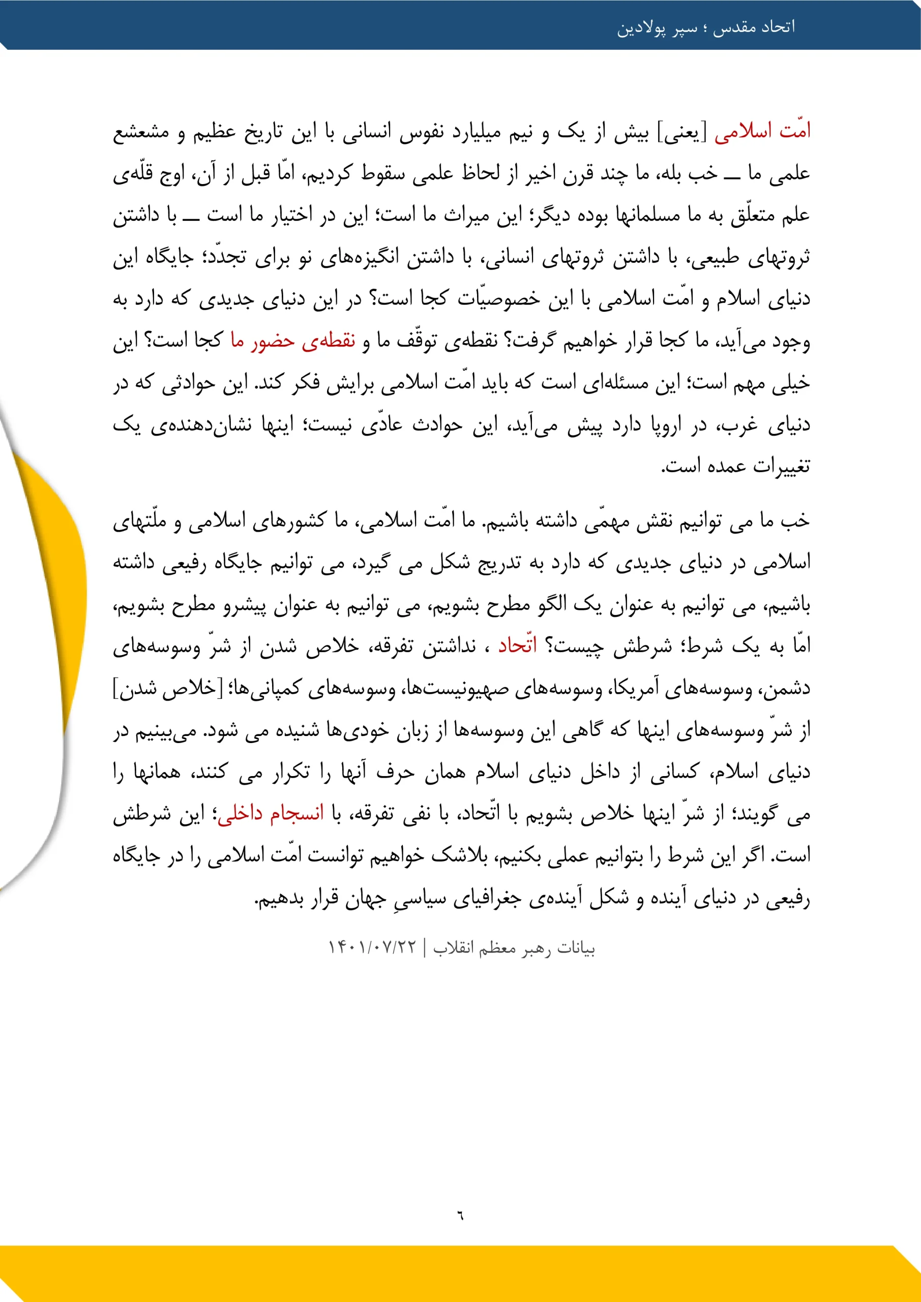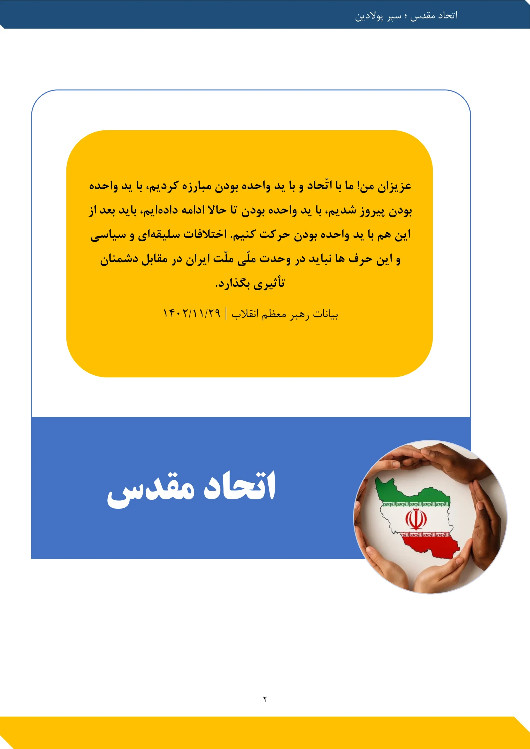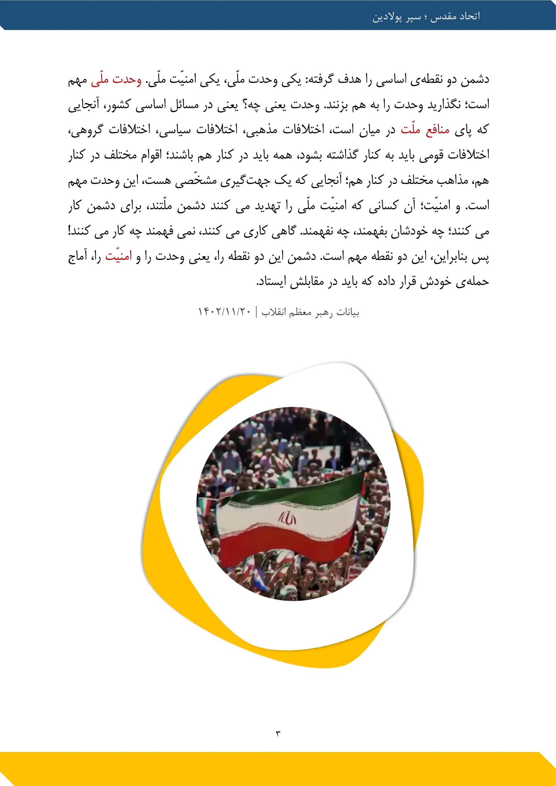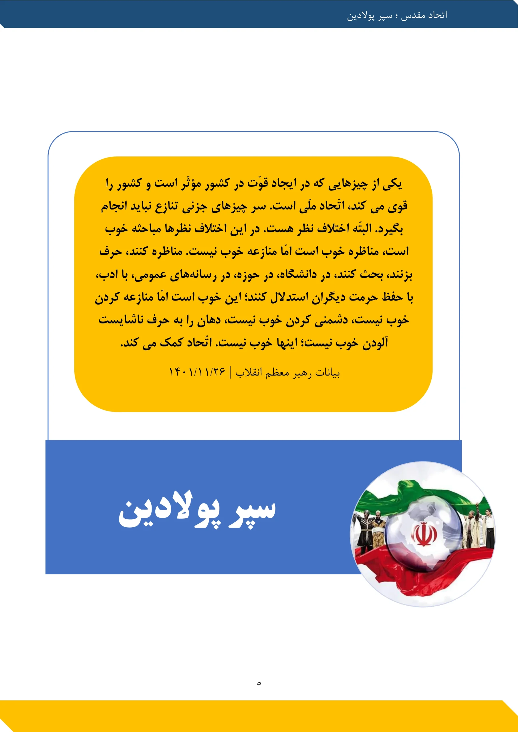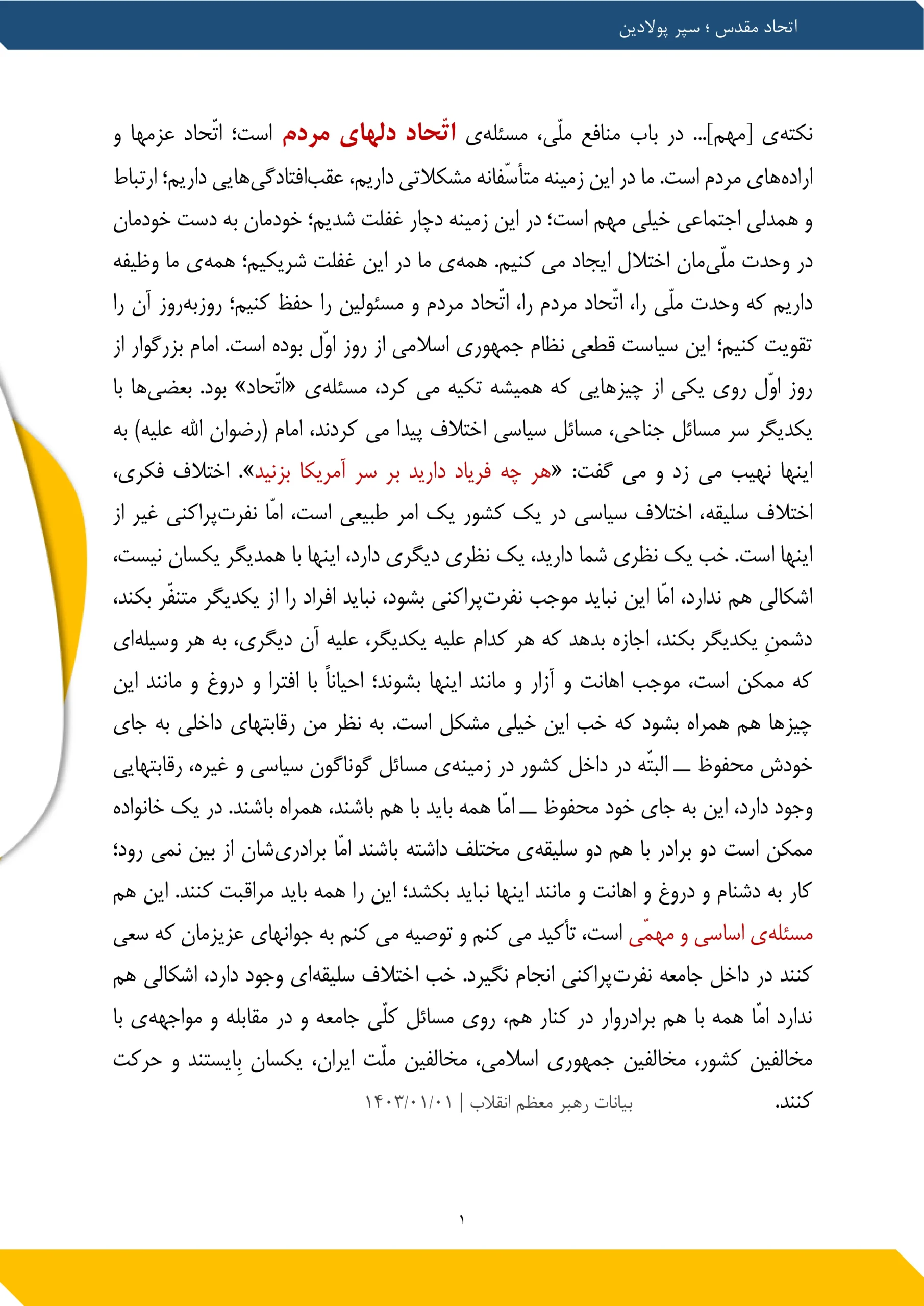 یکی از چیزهایی که در ایجاد قوّت در کشور مؤثّر است و کشور را قوی میکند، اتّحاد ملّی است. سر چیزهای جزئی تنازع نباید انجام بگیرد. البتّه اختلاف نظر هست. در این اختلاف نظرها مباحثه خوب است، مناظره خوب است امّا منازعه خوب نیست. مناظره کنند، حرف بزنند، بحث کنند، در دانشگاه، در حوزه، در رسانه‌های عمومی، با ادب، با حفظ حرمت دیگران استدلال کنند؛ این خوب است امّا منازعه کردن خوب نیست، دشمنی کردن خوب نیست، دهان را به حرف ناشایست آلودن خوب نیست؛ اینها خوب نیست. اتّحاد کمک می کند.